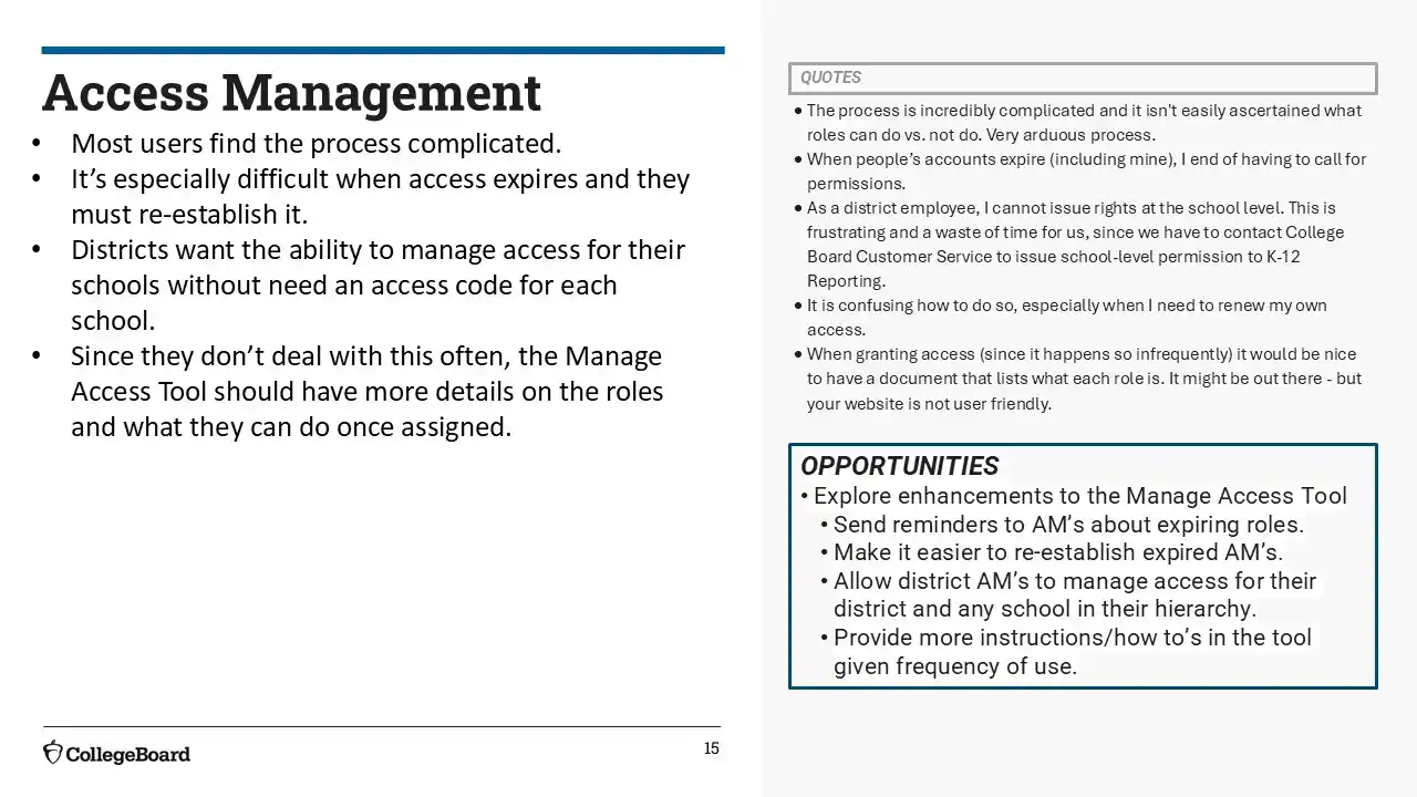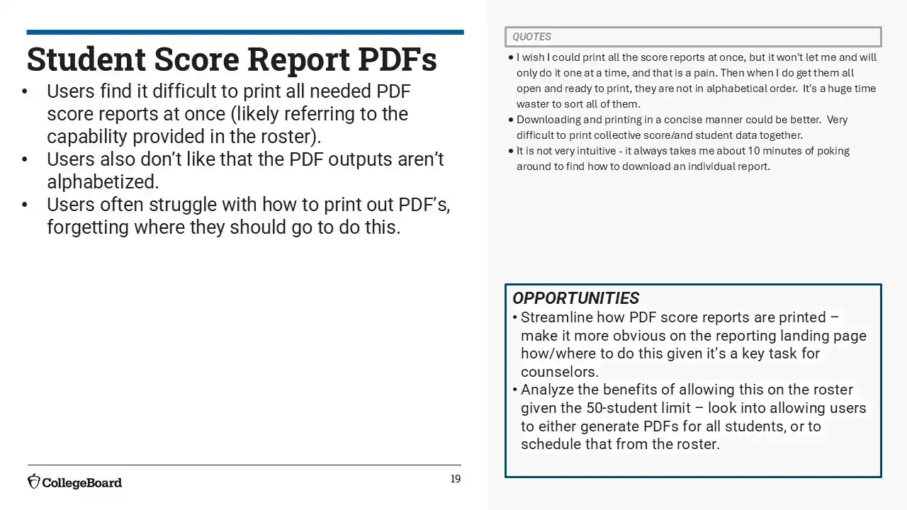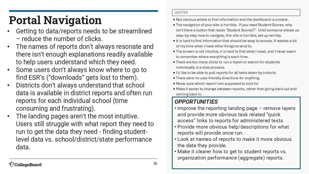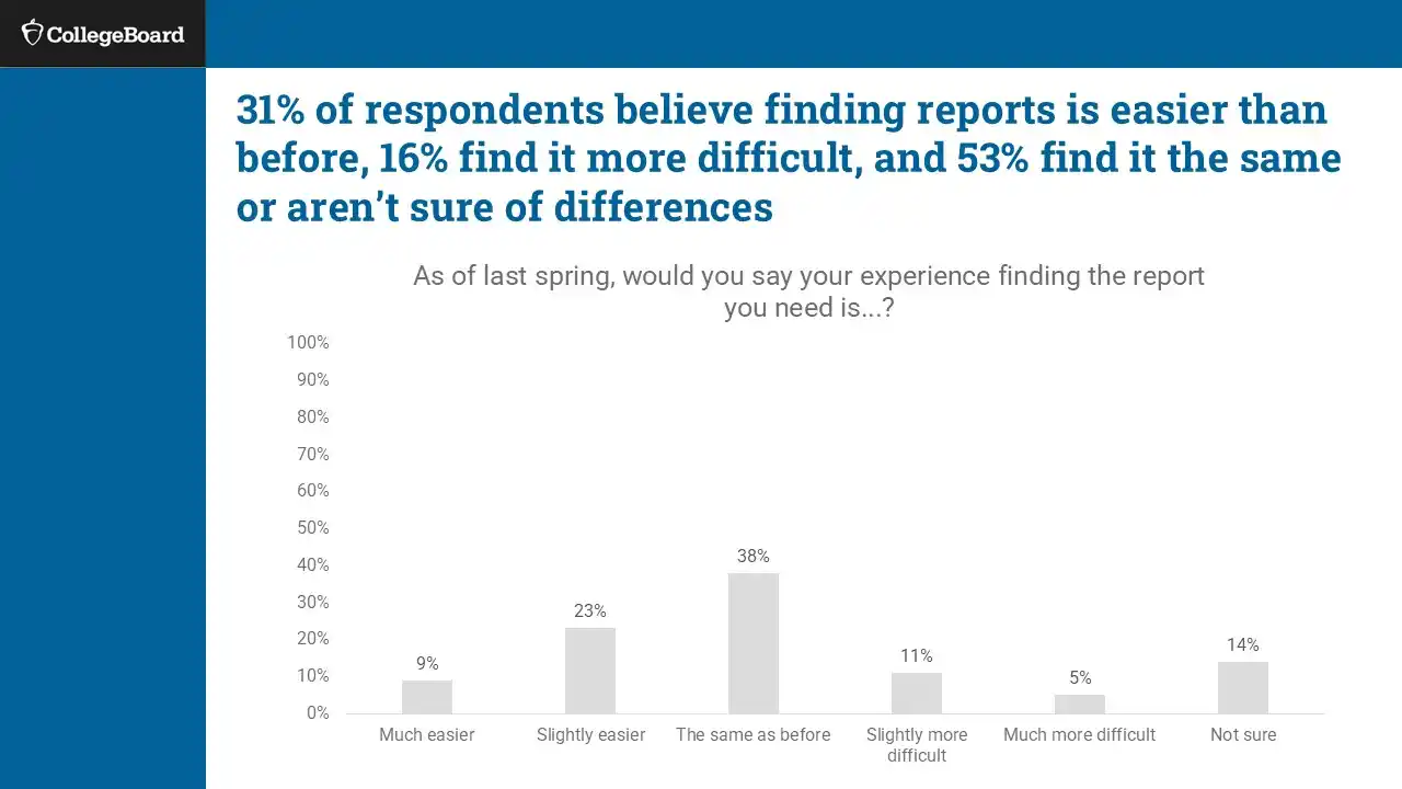 We succeeded in surfacing key tasks like search, score access, and exports through a more unified and intuitive dashboard. Most users found the experience easier than before, with 67% rating it as an improvement. Still, opportunities remain to reduce visual clutter, clarify select report names, and fine-tune layout structure—especially for infrequent users or those unfamiliar with College Board terminology.