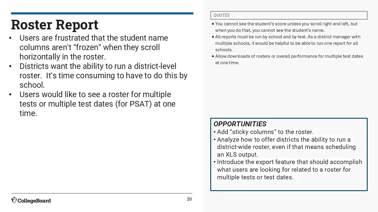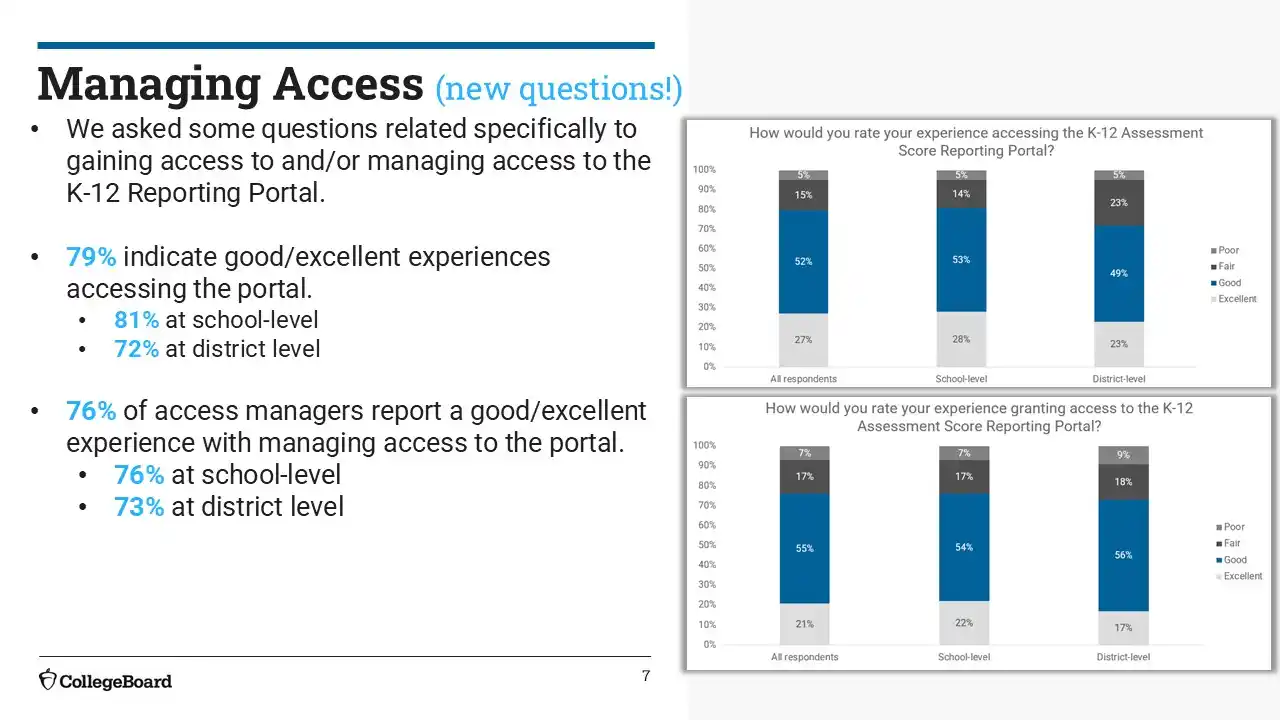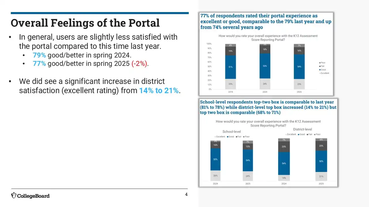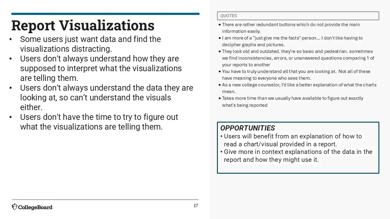We succeeded in surfacing key tasks like search, score access, and exports through a more unified and intuitive dashboard. Most users found the experience easier than before, with 67% rating it as an improvement. Still, opportunities remain to reduce visual clutter, clarify select report names, and fine-tune layout structure—especially for infrequent users or those unfamiliar with College Board terminology.