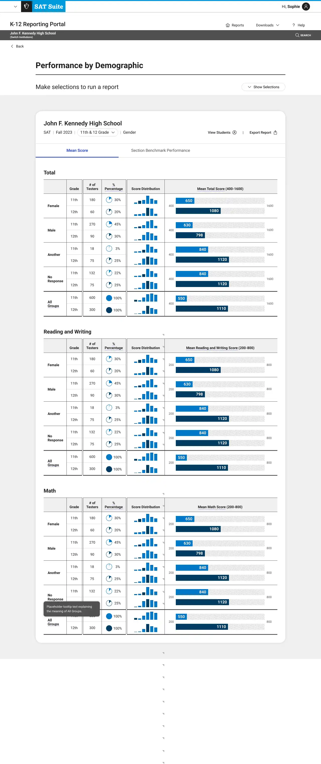 Educators consistently praised the Mean Score graphs in both the “Performance by All Students” and “Performance by Demographics” reports.